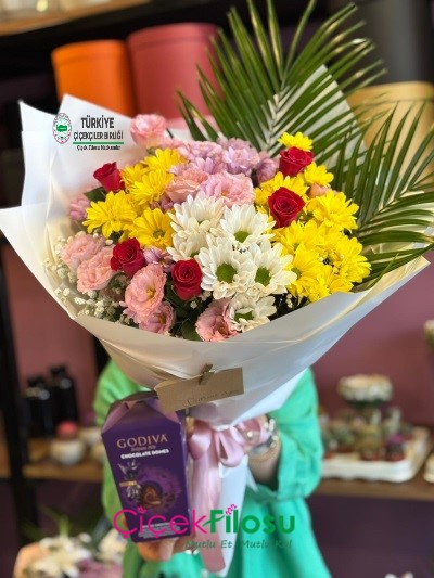 Türkiye’nin en kaliteli çiçeklerinin satışa sunulduğu site cicekfilosu.com üzerinden İstanbul Halkalı’ya sipariş edilen bu renkli papatyalar, kırmızı - pembe güller ve egzotik yeşilliklerden oluşan bu çiçek buketini son derece kaliteli ve canlı çiçeklerle estetik şekilde hazırlayarak yanındaki bir kutu çikolata ile aynı gün teslim eden Halkalı usta çiçekçimize ve İstanbul Halkalı çiçek mağazası çalışanlarına Türkiye Çiçekçiler Birliği olarak gönülden teşekkür ederiz.