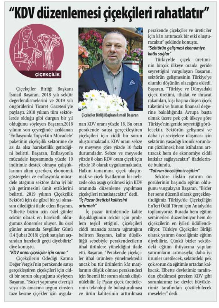 Türkiye'nin en prestijli Ekonomi Gazetesi, Ticaret Gazetesine sektörümüzü değerlendirdik. TÇB Başkanı İsmail Başaran, çiçekçilik sektörü için 2018'in nasıl geçtiğini değerlendirdi. 2019 yılından beklentilerimizi ifade etti.